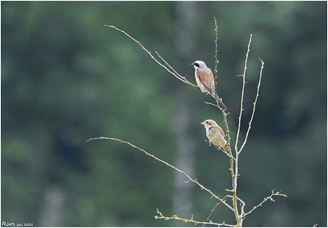Het is en blijft leuk de grauwe klauwier familie te bezoeken en er is vlakbij nog een koppeltje grauwe klauwieren die ook druk zijn met jongen waarvan ik denk dat die nog op het nest gevoerd worden. Je ziet de jongen steeds vliegvaardiger worden en blijven op die manier steeds in de buurt van het mannetje. Ik had al eerder gezien dat een van de jongen braakneigingen vertoonde maar zag toen geen braakbal. Nu is het me gelukt een jong met braakbal te fotograferen omdat de vogel zelf de braakbal vasthield met zijn snavel en het achter het paaltje heeft laten vallen. Veel insecten waaronder een penseelkever. Op de terugweg hoog in de lucht een rode wouw die rondjes aan het vliegen was. Jammer dat hij/zij zo hoog vloog. Wel bijzonder deze soort boven Stramproy te zien. Ik zag iets vanuit mijn ooghoek vliegen en tot mijn verrassing een bekend silhouet. Gelukkig kon ik de auto langs de weg parkeren om een paar foto's te maken. Bij de Kettingdijk heeft een grote groep lepelaars een tussenstop gemaakt. Ik denk dat het de vogels van De Banen zijn die nu zich gaan verplaatsen naar gebieden om op te vetten om later te gaan emigreren. IJsvogeltjes hebben zich ook weer laten zien zowel het mannetje als het vrouwtje. Het is droog veel te droog en je kunt het zien aan de bomen die al veel blad laten vallen of zelfs dood zijn. Poelen drogen op en het water in De Maas staat erg laag. Een poel op de St Maartensheide heeft nog een klein beetje water maar dat zal niet lang meer duren als het niet flink gaat regenen. Geelgorzen maken daar gebruik van om de insecten die op de aanwezige waterplanten zitten, te vangen. Ook de grauwe klauwier zie je regelmatig een duik maken om libellen of andere insecten te vangen die boven de poel vliegen.